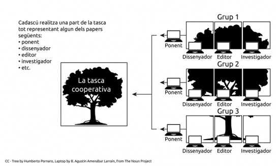 “El grup es divideix en equips especialitzats que realitzen una part de la tasca. Els membres de cada equip tenen funcions específiques. El treball es considera completat quan tots els membres han acabat la seva part.”