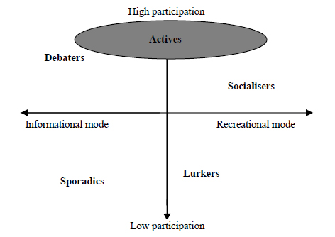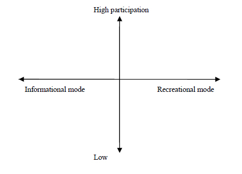 De la mateixa manera que Bartle’s Player Types, Brandtzæg, Petter Bae dibuixa uns eixos de coordenades. L’eix X, describint quin tipus d’interès mou a l’usuari (desde la modalitat més informativa, fins a la modalitat més lúdica). L’eix Y quantifica el nivell de participació de l’usuari.